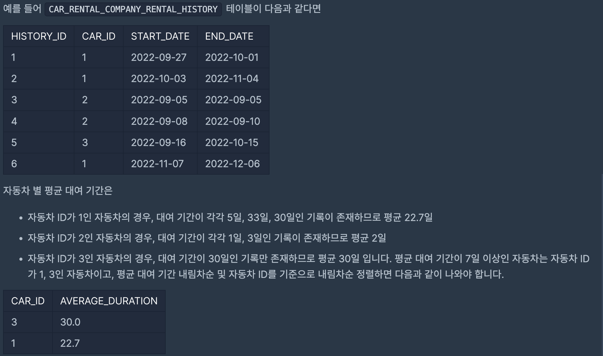 CAR_ID로 GROUP BY하여 해당 자동차의 평균 대여 기간을 구하고, 7일이 넘을 경우에 CAR_ID와 평균 대여 기간을 소수점 2번째 자리에서 반올림한 값을 출력하는 문제입니다.
